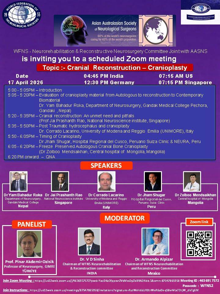 WFNS - Neurorehabilitation & Reconstructive Neurosurgery Committee Joint with AASNS is inviting you to a scheduled Zoom meeting Topic: Cranial Reconstruction - Cranioplasty Time: Apr 17, 2026 04:45 PM Mumbai, Kolkata, New Delhi Join Zoom Meeting https://us02web.zoom.us/j/4636917572?pwd=YacOKoDfppsvrZVdMssDyZbBRADNbb.1&omn=87547865958 View meeting insights with Zoom AI Companion https://us02web.zoom.us/launch/edl?muid=82a089dc-72b7-4d6e-b9ab-4ba678920d4b Meeting ID: 463 691 7572 Passcode: WFNS2 Join instructions https://us02web.zoom.us/meetings/87547865958/invitations?signature=RutWsHdizURBtrWeR6a0k-qS8vnVcxTDtjW_dIsTg6M