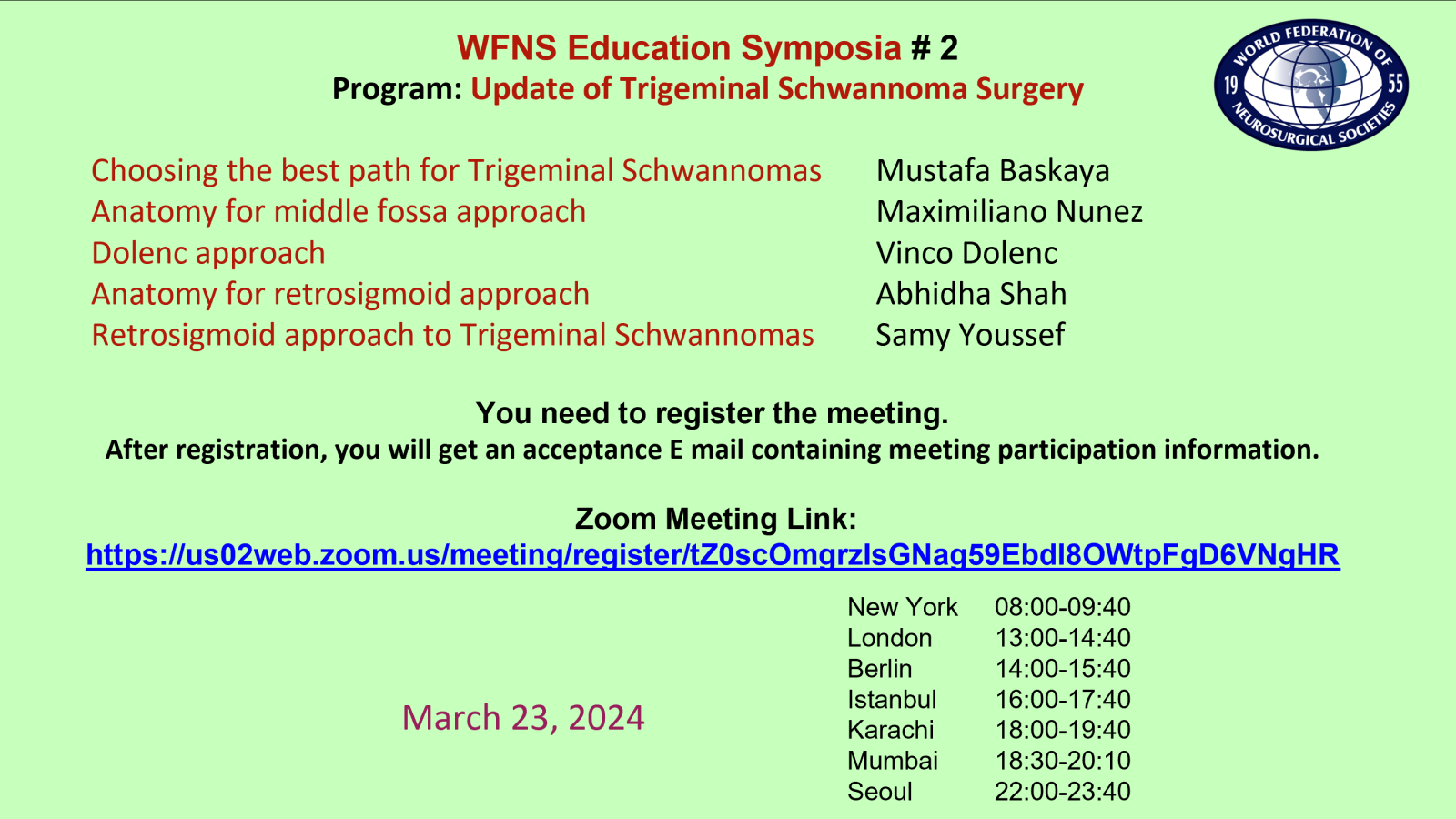 We want to invite you to participate in ‘WFNS Education Symposia #2'' on behalf of the WFNS Education & Training Committee and WFNS Young Neurosurgeons Forum.